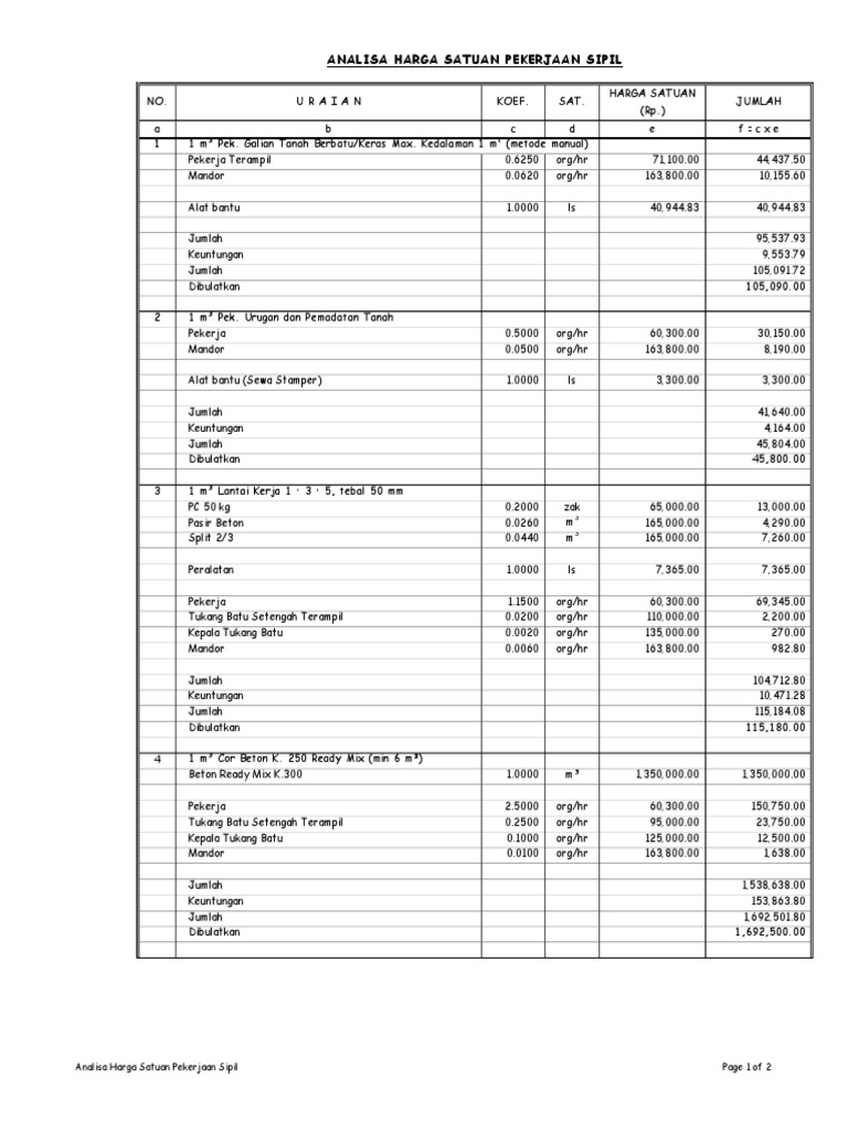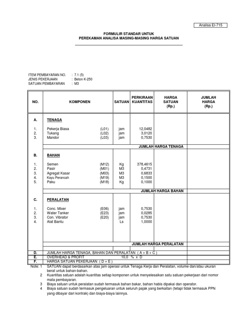 Beton cor mutu k 250 merupakan jenis beton cor yang digunakan dalam pembuatan struktur bangunan rumah tinggal anda. Artinya analisa harga di atas adalah satuan untuk beton k175 satu meter kubik. Arti beton mutu k 250 adalah indikasi dari karakteristik beton pada kuat tekan dengan minimum beban 250 kg cm2 dapat diketahui setelah umur beton selama 28 hari indikasi ini dapat diketahui dengan alat ukura beton yang terbuat dari kubus beton berukuran 15x15x15 cm berdasarkan ketantuan pbi 71. Tenaga pekerja biasa tukang mandor l01 l02 l03 jam jam jam 12 0482 3 0120 0 7530.