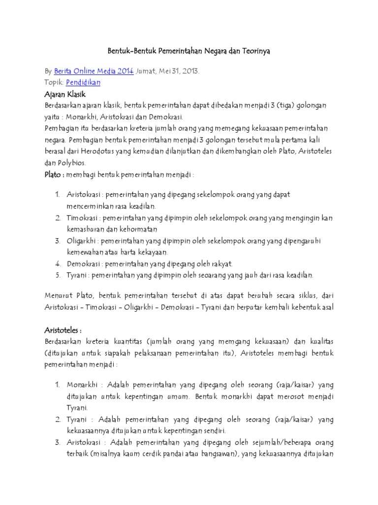 Bahkan mac iver dan leon duguit menyatakan bahwa bentuk negara sama dengan bentuk pemerintahan. Dalam teori klasik bentuk pemerintahan dapat dibedakan berdasarkan jumlah orang yang memerintah dan sifat pemerintahannya. Padmo wahyono sh juga berpendapat bahwa bentuk negara aristokrasi dan demokrasi adalah bentuk pemerintahan klasik sedangkan monarki dan. Mengenai bentuk pemerintahan klasik pada umumnya masih menggabungkan bentuk negara dan bentuk pemerintahan.