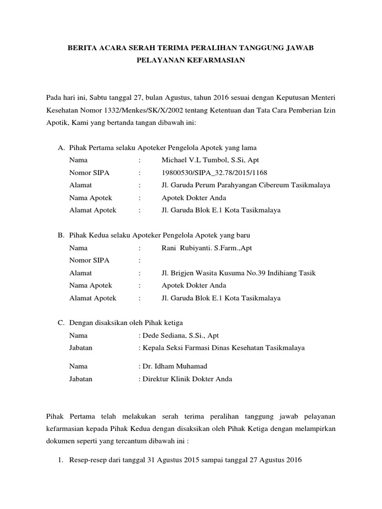 Demikian berita acara serah terima apoteker penanggung jawab ini dibuat oleh kedua belah pihak dan.