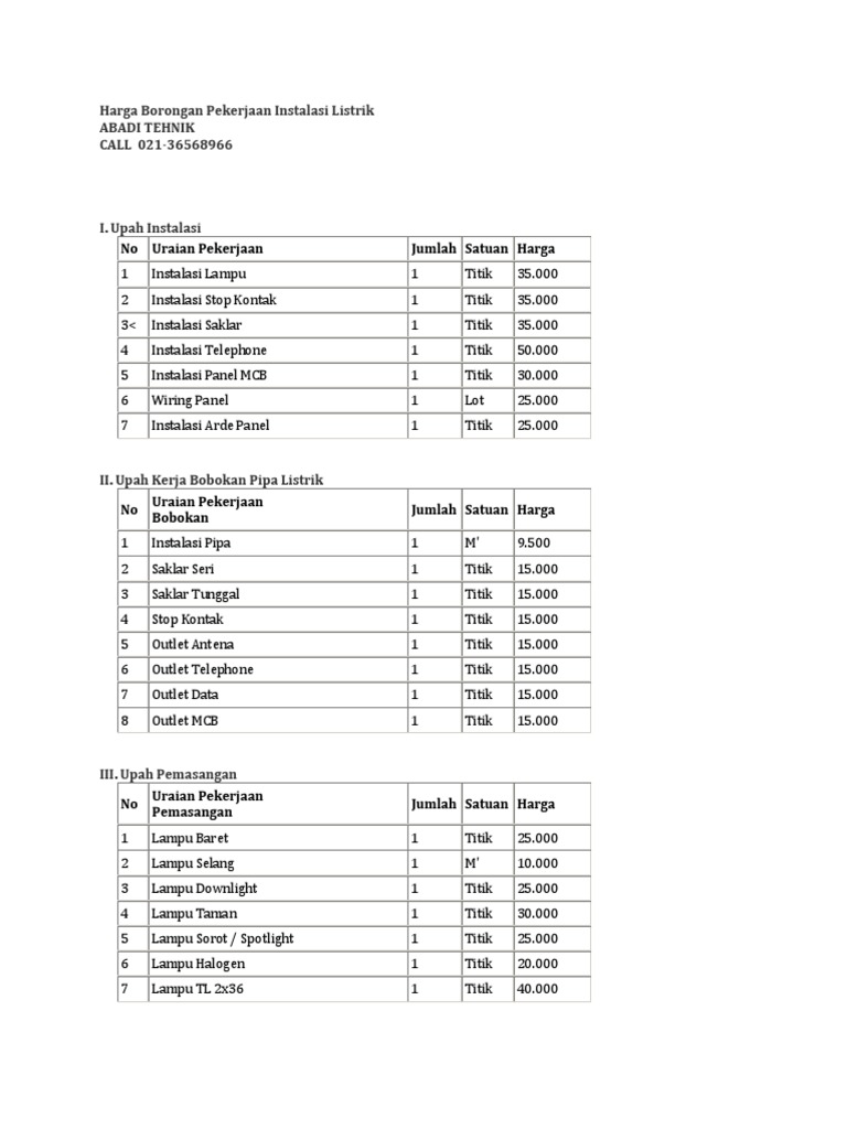 Salah dalam pemasangan atau instalasi listrik dapat mengurangi kenyamanan dan juga bisa mengancam keamanan anda. Harga borongan jasa berikut material all in one pekerjaan meliputi bobokan instalasi kabel pasang lampu dan aksesoris saklar stopkontak dll 1. Instalasi lampu titik rp 250 000 2. Pemasangan stop kontak per titik.