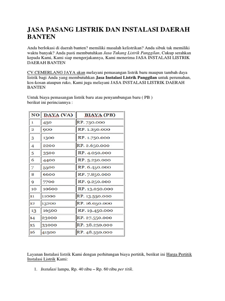 Instalasi stopkontak waterheater titik rp 280 000. Biaya instalasi listrik borongan beserta material biaya instalasi listrik. Salah dalam pemasangan atau instalasi listrik dapat mengurangi kenyamanan dan juga bisa mengancam keamanan anda. Instalasi lampu taman titik rp 270 000 3.