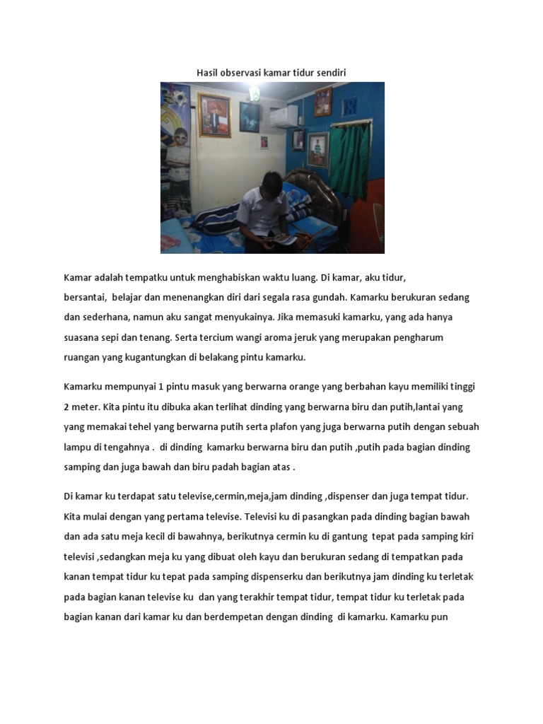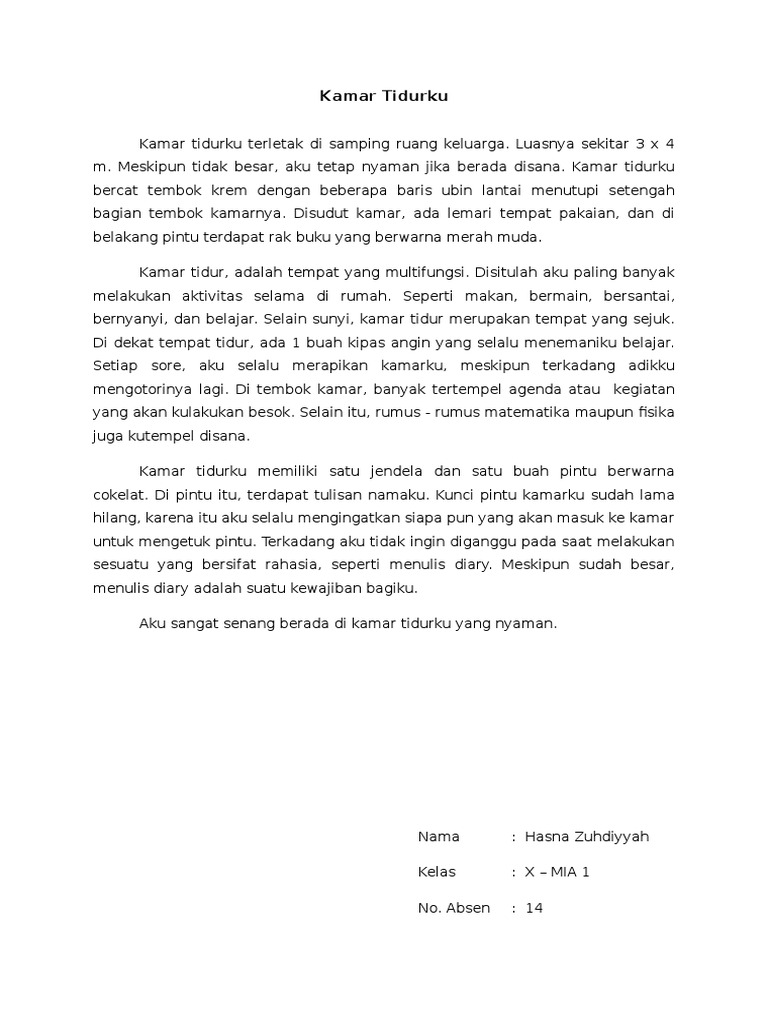 Contoh teks deskripsi kamar tidur. Ada 3 buah kamar tidur. Deskripsi ruang tidur ruang tidur menurut saya adalah tempat paling nyaman tempat yang asik untuk menghabiskan waktu beribadah dan belajar. Di rumah ku memiliki 4 kamar tidur ada 1 ruang tamu 1 bagian dapur 1 kamar mandi didekat dapur 1 kamar mandi di dalam kamar tidur utama dan satu tempat bersantai atau ruang keluarga. Jadi rumahku adalah apartemenku.
