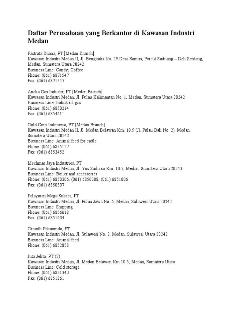Lokasi kawasan industri biasanya berada di tepi ataupun di luar kawasan permukiman dari sebuah kota dan biasanya didukung dengan akses transportasi yang baik seperti jalan dan rel. Medan fastrata buana pt medan branch kawasan industri medan ii jl. Daftar perusahaan yang berkantor di kawasan industri medan april 14 2010 admincantik. Kawasan inididirikan pada tanggal 7 oktober 1988 dengan komposisi sahamnya terdiri dari pemerintah ri pusat 60 pemerintah propinsi sumatera utara 30 dan pemerintah kota medan 10.