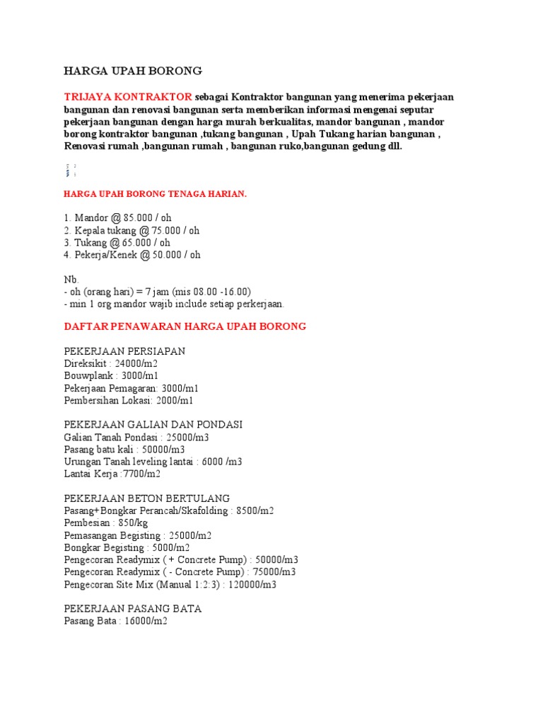 Pada umumnya beton yang terbuat dari campuran semen pasir kerikil dan air memiliki kualitas yang berbeda beda hasilnya tergantung dari formula campuran bahan bahannya. Jika menggunakan smartphone putar layar untuk melihat tabel secara penuh. Bongkar beton lantai gudang brap per mtr nya untuk ukuran 22 mtrx 90 mtr sampai brap. Harga upah borongan pekerjaan bangunan rumah 2014.