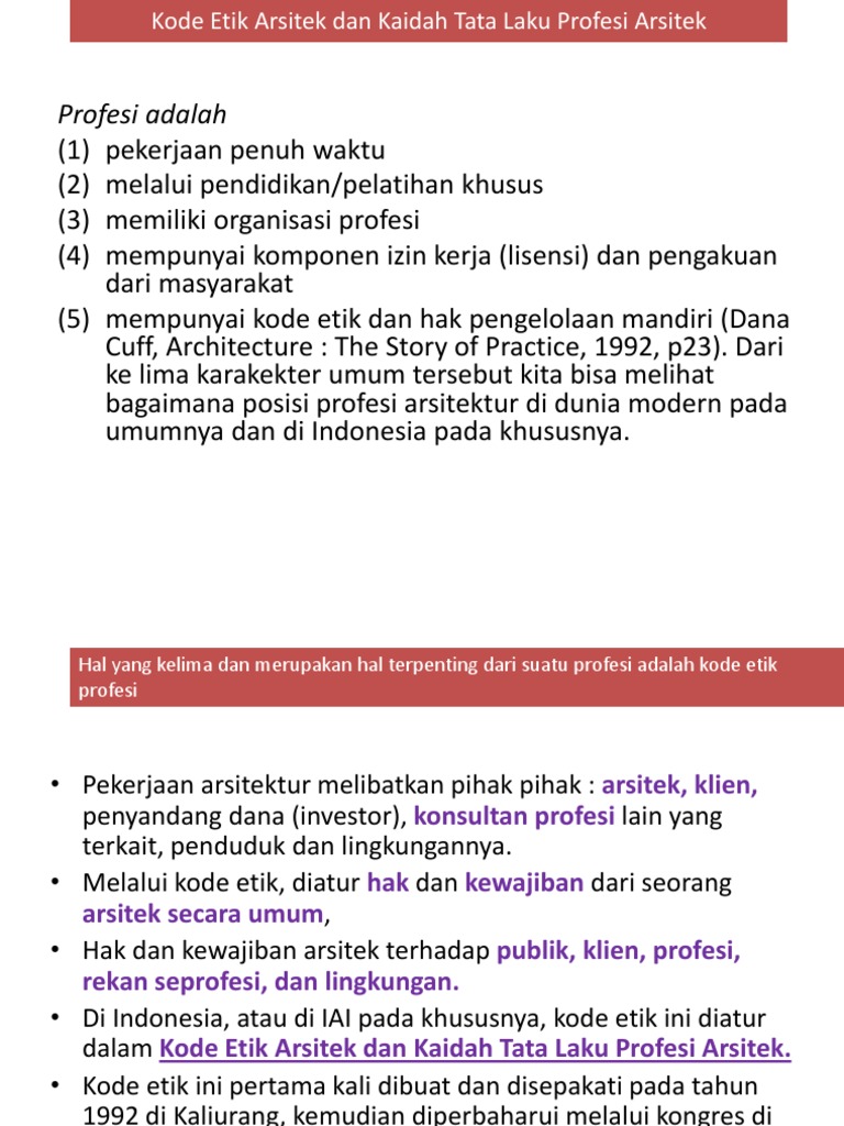 Kode etik arsitek dan kaidah tata laku profesi arsitek ikatan arsitek indonesia ringkasan kode etik dan kaidah tata laku arsitek iai pertama kali diterbitkan di kaliurang pada tahun 1992.