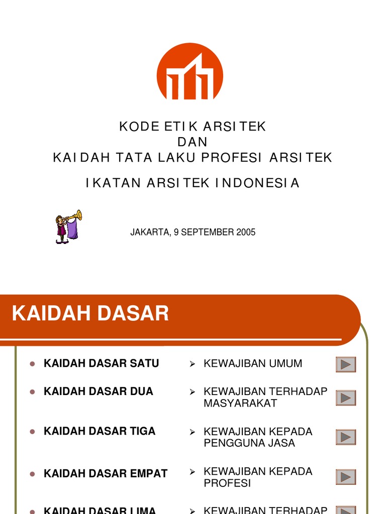 Kode etik arsitek. Kaidah dasar merupakan kaidah pengarahan secara luas sikap ber etika seorang arsitek. Kode etik arsitek dan kaidah tata laku profesi arsitek. Ad art ikatan arsitek indonesia. Mukadimah 5 lima kaidah dasar 21 dua puluh satu standar etika dan 45 empat puluh lima kaidah tata laku.