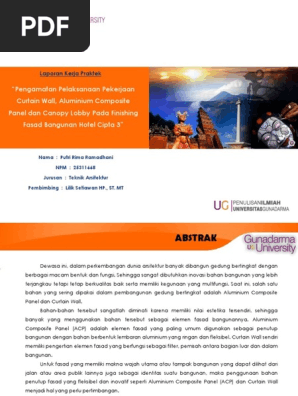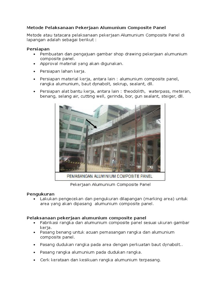 Persiapan persiapan dan pengajuan job shop gambar gambar dari panel aluminium komposit. Metode pelaksanaan pekerjaan alumunium composite panel adalah sebagai berikut. Pemasangan lembaran acp yang telah difabrikasi pada konstruksi rangka dudukan. Seiring berkembangnya teknologi dalam bidang building maka sekarang orang sudah mulai beralih untuk menggunakan berbagai bahan material yang berkualitas mudah didapatkan dan memberikan efek yang baik.