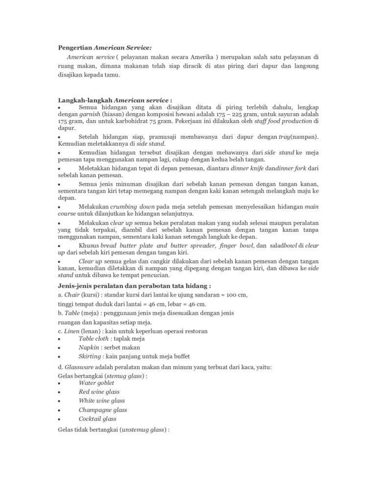 Pengertian american service. Setelah hidangan siap pramusaji membawanya dari dapur dengan tray nampan. American service pelayanan makan secara amerika merupakan salah satu pelayanan di ruang makan dimana makanan telah siap diracik di atas piring dari dapur dan langsung disajikan kepada tamu. American service pelayanan makan secara amerika merupakan salah satu pelayanan di ruang makan dimana makanan telah siap diracik di atas piring dari dapur dan langsung disajikan kepada tamu. Pengertian plate service american service plate service american service merupakan salah satu cara menghidangkan makanan di ruang makan restoran dimana makanan tersebut sudah di siapkan diatas piring s ecara lengkap dan menarik dari dapur dan kemudian dihidangkan dari sebelah kanan tamu dengan menggunakan tangan kanan dan yang dilayani adalah.