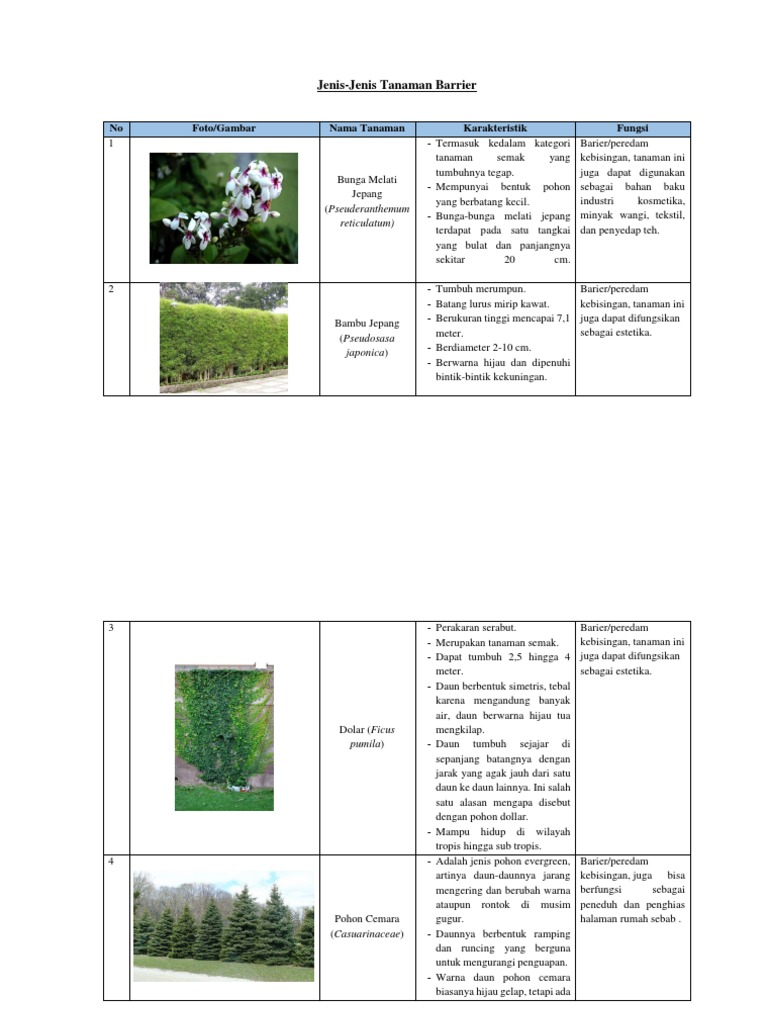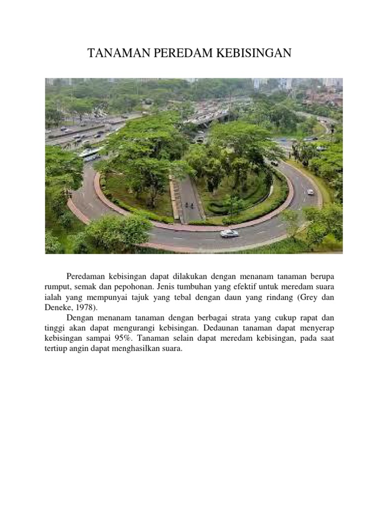 Tanaman peredam kebisingan peredaman kebisingan dapat dilakukan dengan menanam tanaman berupa rumput semak dan pepohonan jenis tumbuhan yang efektif untuk meredam suara ialah yang mempunyai tajuk yang tebal dengan daun yang rindang grey dan deneke 1978. Penghasil oksigen dan peredam kebisingan huboyo dan sumiati 2008. Pohon ini dapat dijakan sebagai alternatif untuk peredam kebisingan yang disebabkan oleh polusi suara karena memiliki daun yang lebat dan rindang. Pada bambu jepang selain pohon dan daunnya yang.