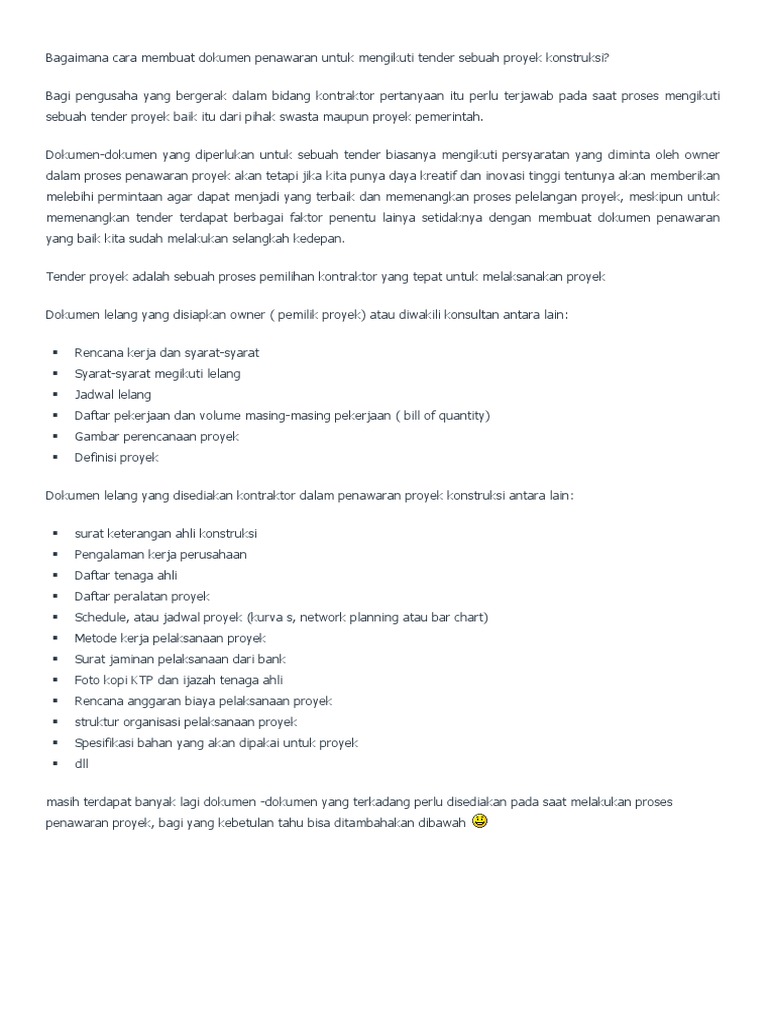 Jadi intinya dalam mengikuti proses tender suatu proyek konstruksi harus benar benar membaca memahami isi dalam dokumen tender sehingga tidak ada kesalahan dalam pengisian dokumen tender.