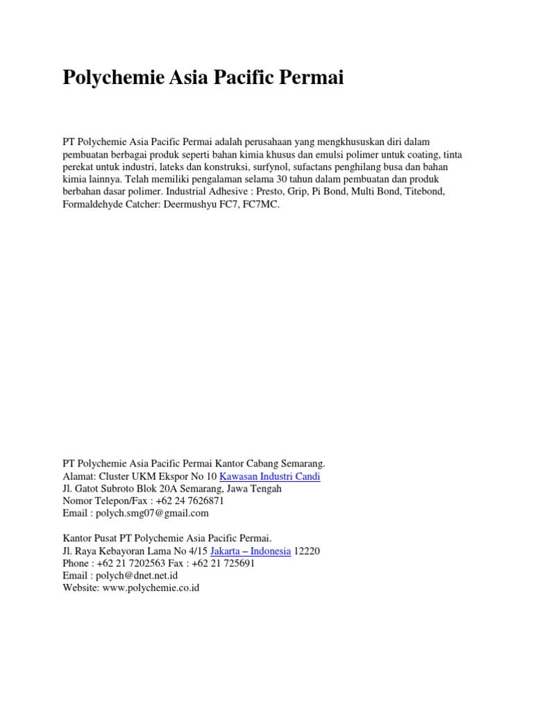 Pt polychemie asia pacific permai. Polychemie asia pacific permai pt polychemie asia pacific permai adalah perusahaan yang mengkhususkan diri dalam pembuatan berbagai produk seperti bahan kimia khusus dan emulsi polimer untuk coating tinta perekat untuk industri lateks dan konstruksi surfynol sufactans penghilang busa dan bahan kimia lainnya. Just let us know how we can help you. Polychemie asia pacific permai 2011 contact us now. Polychemie asia pacific permai jakarta.