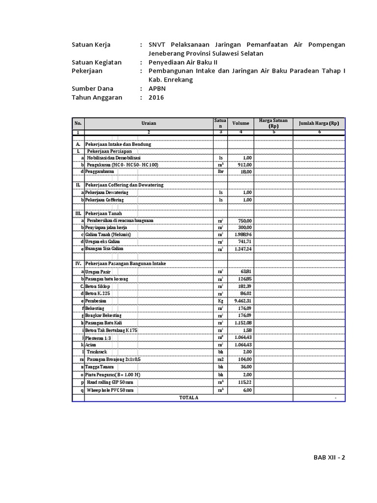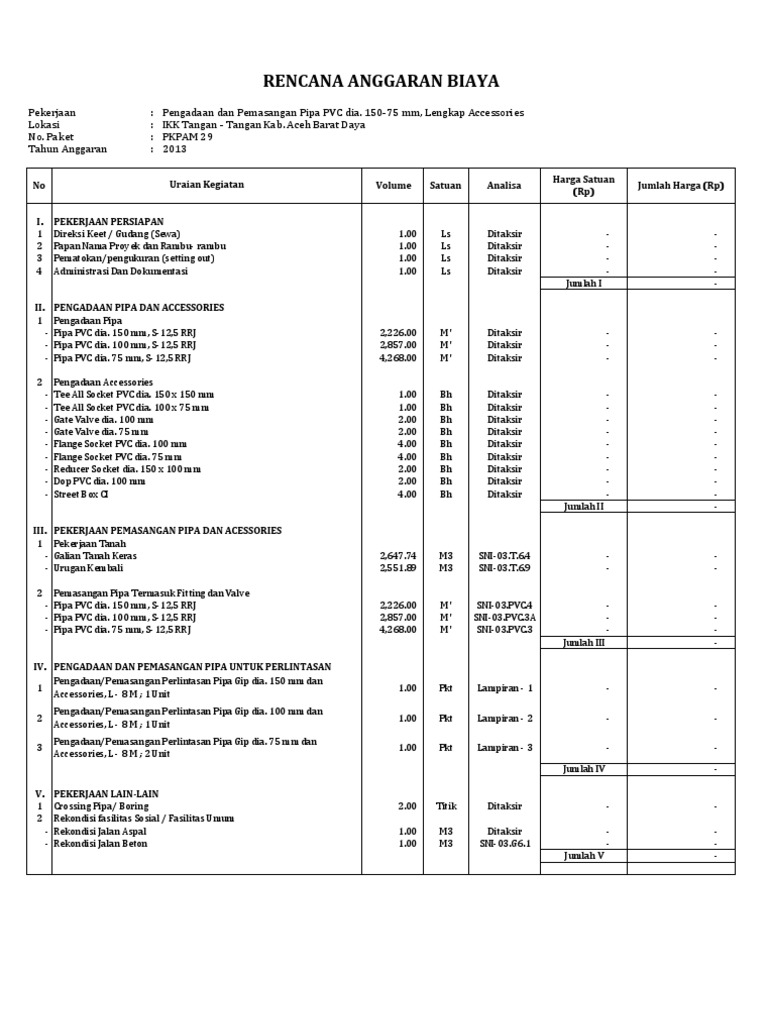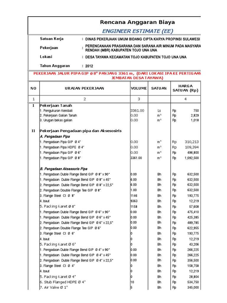 10 pemasangan pipa jl bina marga kedalaman 150 cm pipa pvc gip 50 0 47 galian tanah keras 27 480 12 778 0 47 urugan kembali dipadatkan 23 460 10 909 0 03 tukang pipa 40 000 1 250 0 supervisor 47 500 149 0 09 pekerja 30 000 2 813 0 01 mandor 40 000 500 1 angkutan lokal 1 000 1 000. Download sofcopy metode pelaksanaan pemasangan jaringan pipa air bersih spam dan aksesorisnya 4 comments selamat datang kembali kepada rekan rekan sudut sipil sekalian. Rencana anggaran biaya rab pembangunan jaringan pipa rencana anggaran biaya bangunan atau sering disingkat rab adalah perhitungan biaya bangunan berdasarkan gambar bangunan dan spesifikasi pekerjaan konstruksi yang akan di bangun sehingga dengan adanya rab dapat dijadikan sebagai acuan pelaksanaan pekerjaan nantinya. Pipa pvc merupakan pipa yang paling sering digunakan untuk sistem plumbing di berbagai jenis bangunan karena berbagai kelebihannya seperti pernah kami coba ulas dalam artikel sebelumnya tentang pipa pvc untuk sistem pemipaan bangunan.