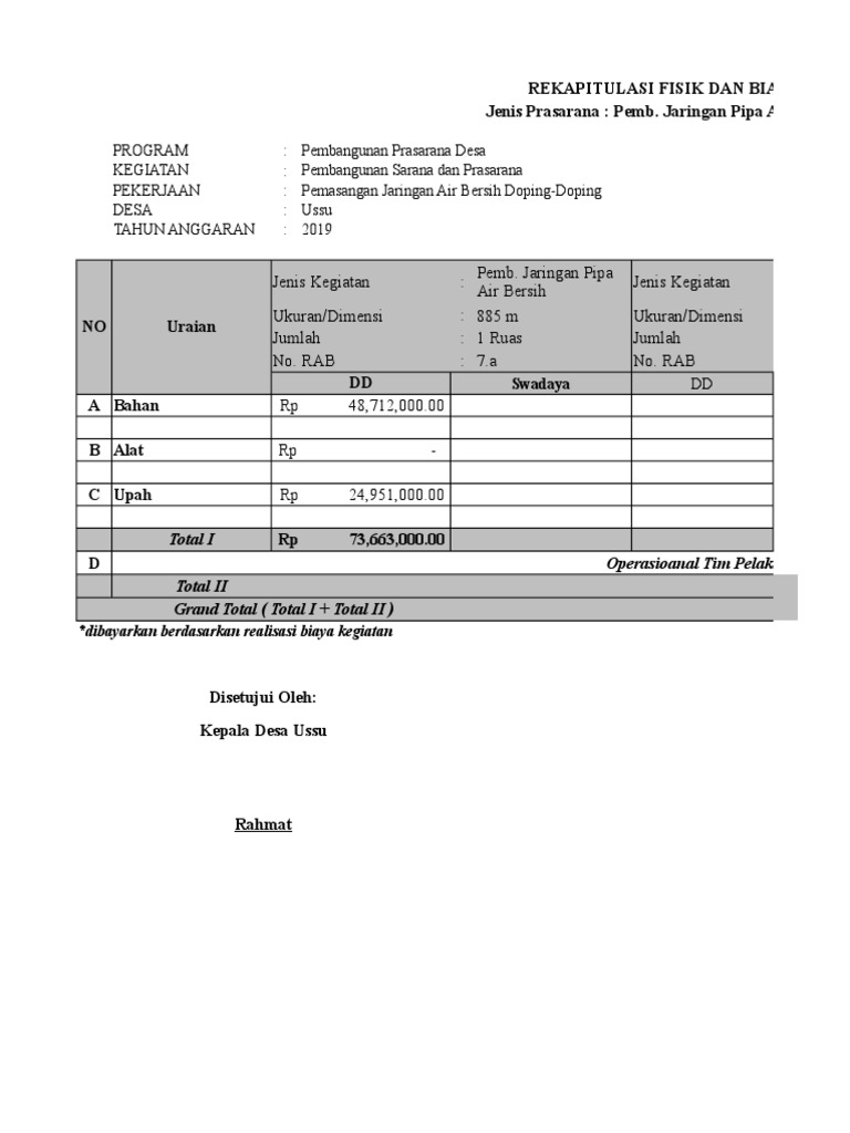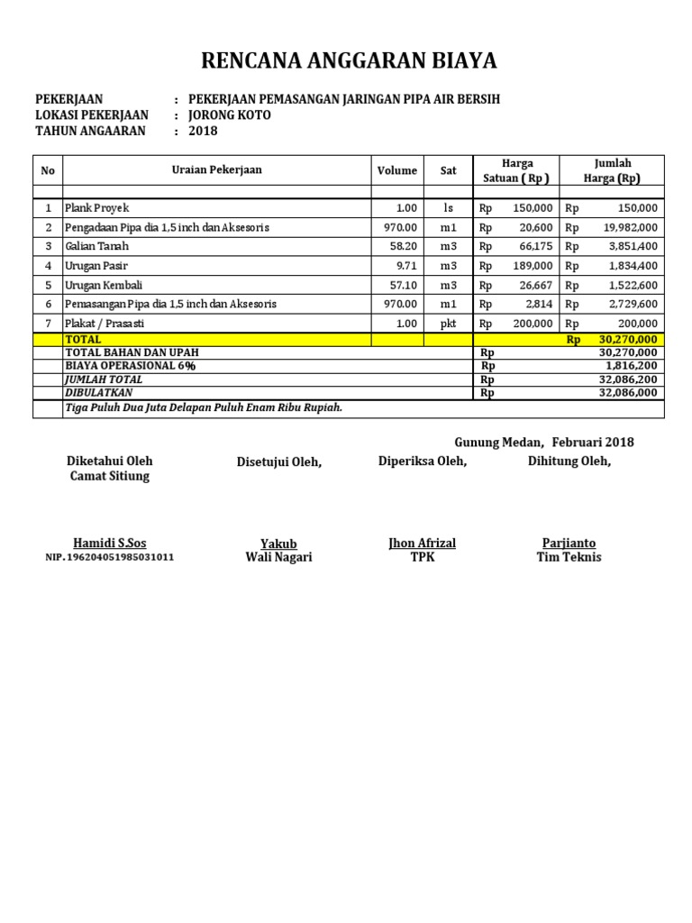 Pengadaan pemasangan hiacter 2 unit rp 3 000 000. Pengadaan pemasangan tabung gas 2 unit 12kg regulator slang. Pengertian air bersih air bersih adalah air yang digunakan untuk keperluan sehari hari yang kualitasnya memenuhi syarat syarat kesehatan dan dapat diminum setelah dimasak sutrisno dkk 1987 23 jumlah penduduk pemakai air bersih pertambahan penduduk dapat dianalisa dengan menggunakan tiga metode di bawah ini dan dari. Contoh rab pipa ikk tangan tangan.
