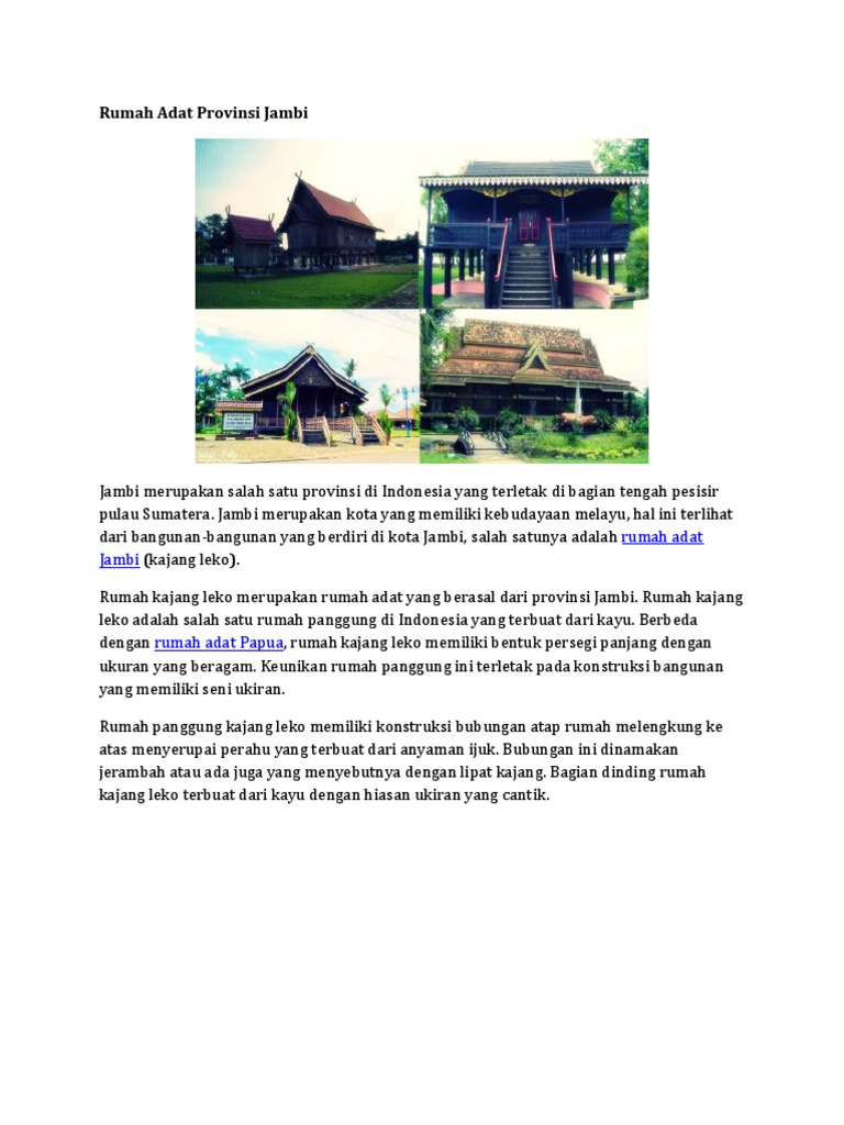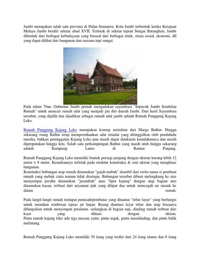 Rumah yang jika dilihat dari atas berbentuk persegi panjang dengan ukuran 12 x 9 meter ini berdiri karena ditopang oleh 30 tiang berukuran besar yang terdiri dari 24 tiang utama dan 6 tiang pelamban. Rumah adat jambi panggung kajang leko. Kota jambi terbentuk ketika kerajaan melayu jambi berdiri sekitar abad xvii.