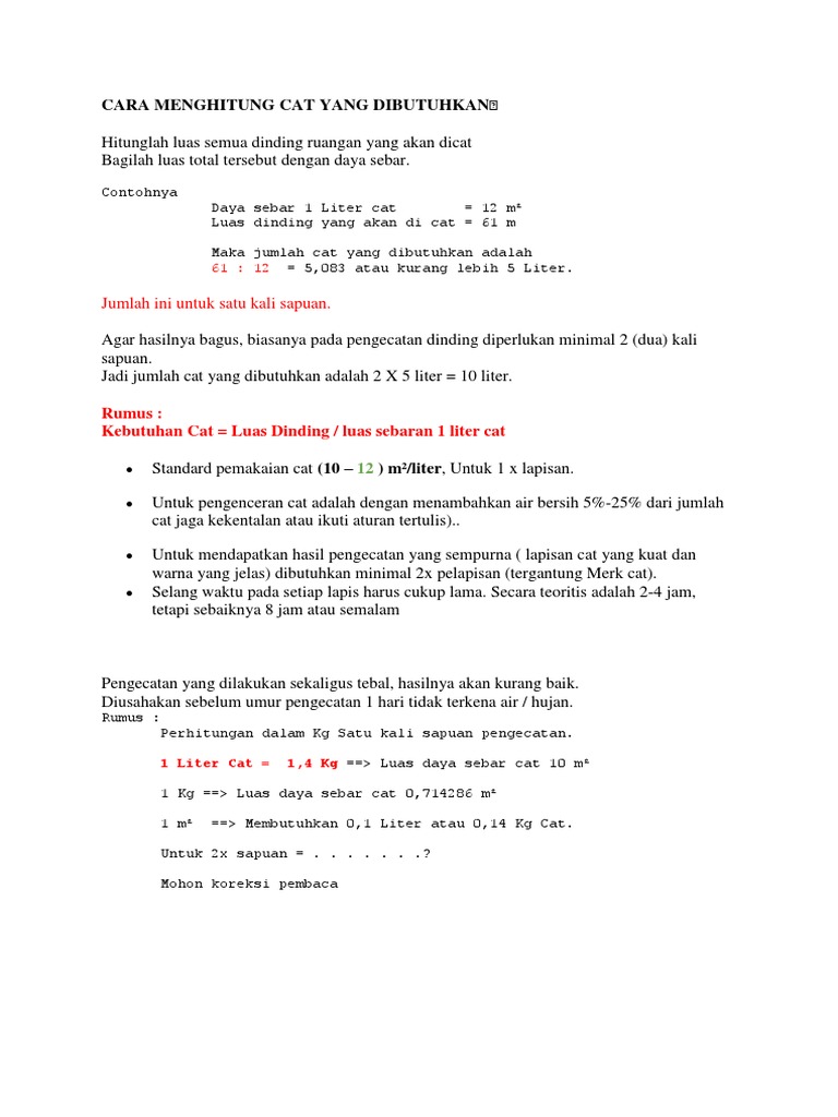 Cara menghitung kebutuhan cat atau coating secara umum menggunakan rumus sebagai berikut. Melalui rumus menghitung kebutuhan cat dinding rumah di atas dapat disimpulkan bahwa kebutuhan cat untuk ruangan dengan luas 3 x 5 m adalah 4 liter untuk satu kali pelapisan cat. Kebutuhan cat luas akan di cat daya sebar 1 liter. Maka rumus perhitungan kebutuhan cat menjadi.