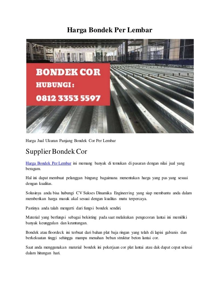 Ukuran bondek per lembar. 0 75 mm dan 1 mm dengan lebar 1 meter lari pun untuk ukuran bisa di sesuaikan menurut pesanan tentunya kami tawarkan dengan harga sangat kompetitif yang ada di pasaran yg berlaku untuk anda dimanapun kebutuhannya kami siap antar hingga pelosok nusantara indonesia. Sebagai bahan pertimbangan dalam memilih jenis bondek untuk kebutuhan anda berikut ini adalah harga bondek per lembar terbaru. Anda mungkin kerap melihat aplikasi material ini di langit langit dibawah lantai 2 bawah plat lantai. Ukuran panjang lebar bondek per meter tangerang berdiskusi mengenai bahan bangunan pastinya anda mengetahui tentang bondek material hal yang demikian acap kali digunakan untuk melengkapi kebutuhan dalam pembangunan rumah gedung atau bangunan lainnya.